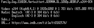 | FiLENAME: | Family.Guy.S16E06.Vertwittert.GERMAN.DL.1080p.WEBRiP.x264-OCA.mkv |