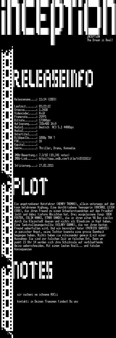 | FiLENAME: | 11.14.Elevenfourteen.2003.German.AC3.HDRip.XviD-iNCEPTiON.avi |