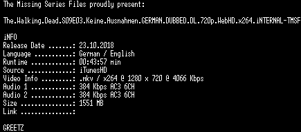 | FiLENAME: | The.Walking.Dead.S09E03.Keine.Ausnahmen.GERMAN.DUBBED.DL.720p.WebHD.x264.iNTERNAL-TMSF.mkv |