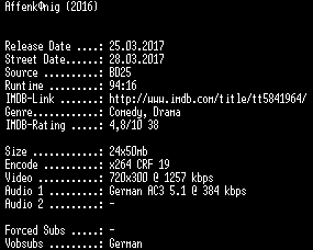| FiLENAME: | Affenkoenig.German.2016.AC3.BDRip.x264-SPiCY.mkv |