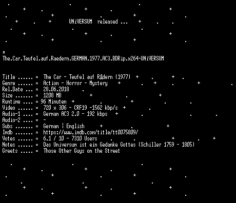 | FiLENAME: | The.Car.Teufel.auf.Raedern.GERMAN.1977.AC3.BDRip.x264-UNiVERSUM.mkv |