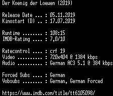 | FiLENAME: | Der.Koenig.der.Loewen.German.2019.AC3.BDRip.x264-COiNCiDENCE.mkv |