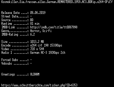 | FiLENAME: | Kosmokiller.Sie.fressen.alles.German.REMASTERED.1959.AC3.BDRip.x264-SPiCY.mkv |