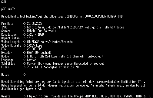 | FiLENAME: | David.Wants.To.Fly.Ein.Yogisches.Abenteuer.2010.German.DOKU.1080P.WebHD.H264-GWD.mkv |