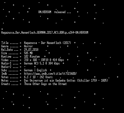 | FiLENAME: | Hagazussa.Der.Hexenfluch.GERMAN.2017.AC3.BDRip.x264-UNiVERSUM.mkv |