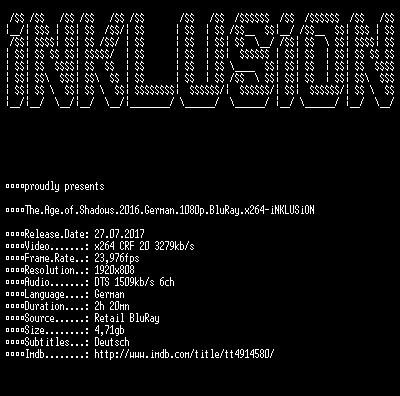| FiLENAME: | The.Age.of.Shadows.2016.German.1080p.BluRay.x264-iNKLUSiON.mkv |