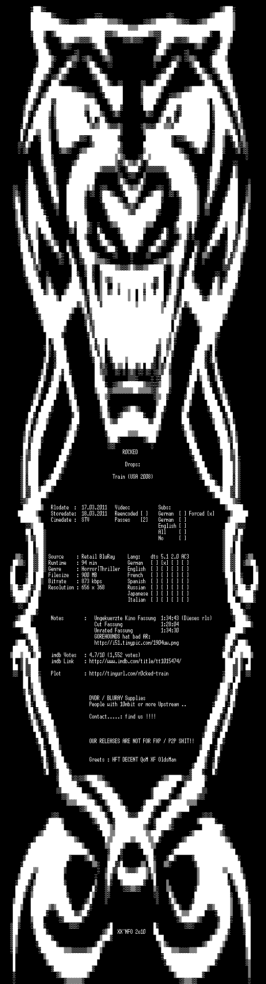 | FiLENAME: | Train.Naechster.Halt.Hoelle.UNCUT.German.2008.AC3.BDRiP.PROPER.XviD-R0CKED.avi |