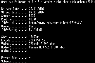 | FiLENAME: | American.Poltergeist.3.Sie.werden.nicht.ohne.dich.gehen.German.2015.AC3.BDRip.x264-SPiCY.mkv |