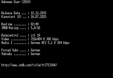 | FiLENAME: | Unknown.User.German.2014.AC3.BDRiP.x264-EXQUiSiTE.mkv |