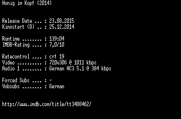 | FiLENAME: | Honig.im.Kopf.German.2014.AC3.BDRiP.x264-EXQUiSiTE.mkv |