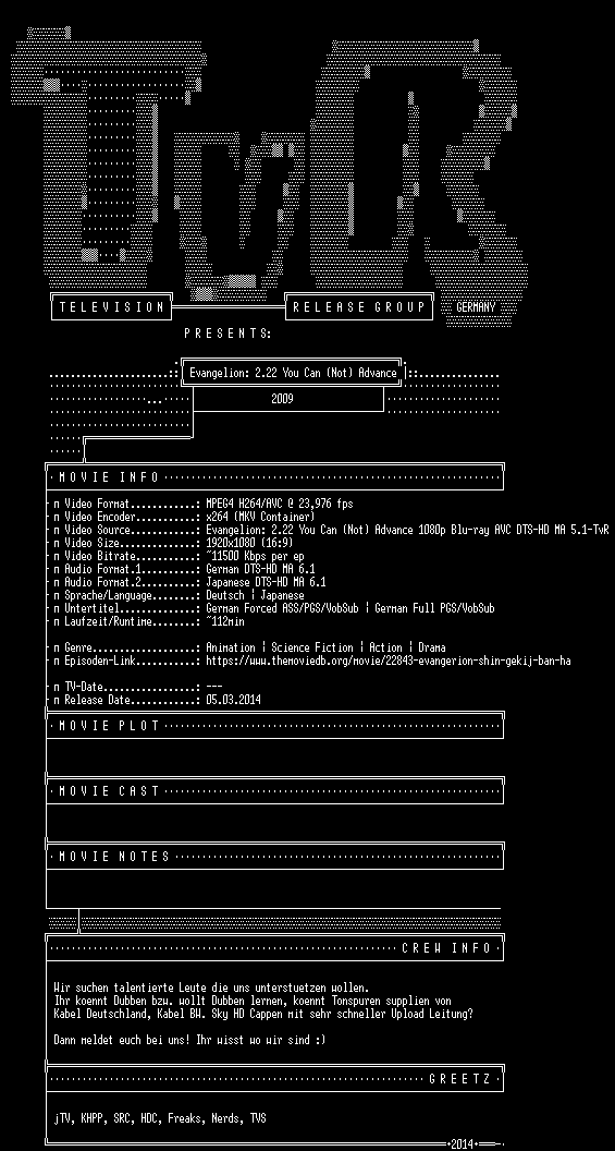 | FiLENAME: | Evangelion.2.22.You.Can.Not.Advance.GERMAN.6.1.DL.DTSHD.ANiME.BDRiP.1080p.WS.x264-TvR.mkv |