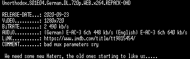 | FiLENAME: | Unorthodox.S01E04.German.DL.720p.WEB.x264.REPACK-OHD.mkv |
