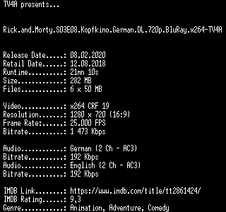 | FiLENAME: | Rick.and.Morty.S03E08.Kopfkino.German.DL.720p.BluRay.x264-TV4A.mkv |
