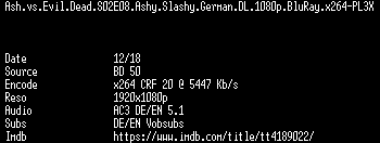 | FiLENAME: | Ash.vs.Evil.Dead.S02E08.Ashy.Slashy.German.DL.1080p.BluRay.x264-PL3X.mkv |