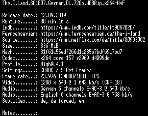 | FiLENAME: | The.I.Land.S01E07.German.DL.720p.WEBRip.x264-WvF.mkv |