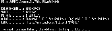 | FiLENAME: | Elite.S03E02.German.DL.720p.WEB.x264-OHD.mkv |
