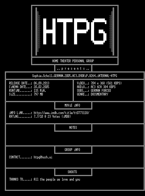 | FiLENAME: | Sophie.Scholl.GERMAN.2005.AC3.DVDRiP.X264.iNTERNAL-HTPG.mkv |