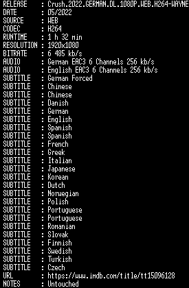 | FiLENAME: | Crush.2022.GERMAN.DL.1080P.WEB.H264-WAYNE.mkv |