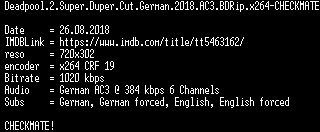 | FiLENAME: | Deadpool.2.Super.Duper.Cut.German.2018.AC3.BDRip.x264-CHECKMATE.mkv |