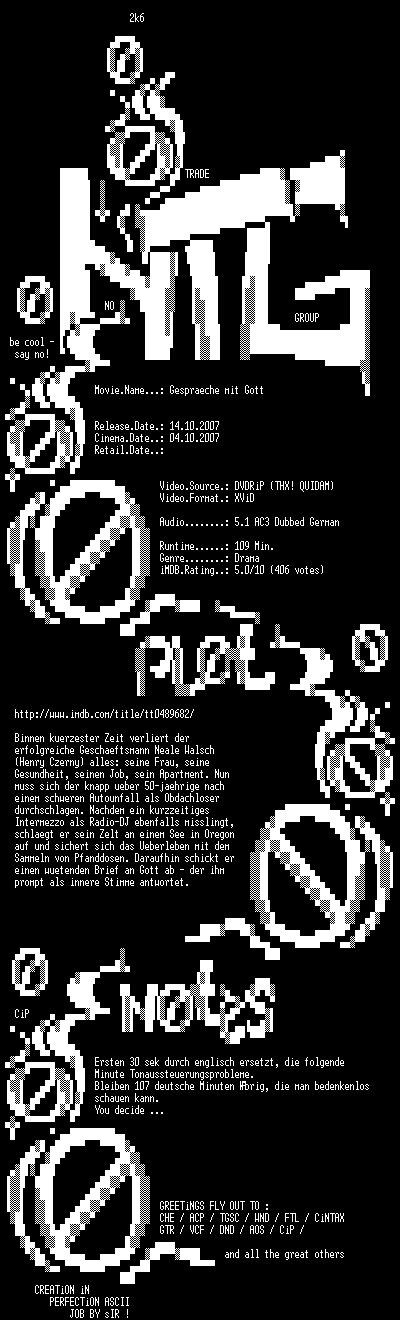 | FiLENAME: | Gespraeche.mit.Gott.DVDRiP.AC3.Dubbed.German.XViD-NTG.CD1.avi |