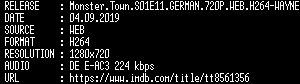 | FiLENAME: | Monster.Town.S01E11.GERMAN.720P.WEB.H264-WAYNE.mkv |