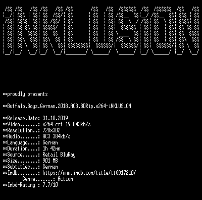 | FiLENAME: | Buffalo.Boys.German.2018.AC3.BDRip.x264-iNKLUSiON.mkv |