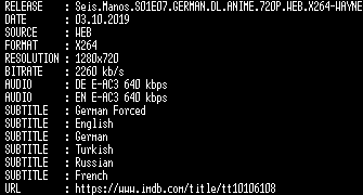 | FiLENAME: | Seis.Manos.S01E07.GERMAN.DL.ANIME.720P.WEB.X264-WAYNE.mkv |