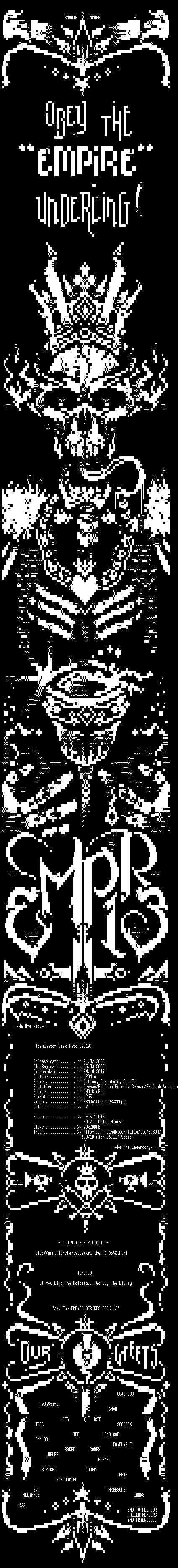 | FiLENAME: | Terminator.Dark.Fate.2019.German.DL.2160p.UHD.BluRay.x265-EmpireHD.mkv |