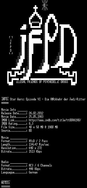 | FiLENAME: | Star.Wars.Episode.VI.Die.Rueckkehr.der.Jedi.Ritter.German.1983.AC3.BDRiP.XViD.iNTERNAL-iFPD.avi |