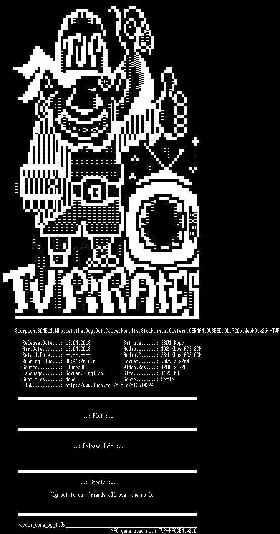 | FiLENAME: | Scorpion.S04E11.Who.Let.the.Dog.Out.Cause.Now.Its.Stuck.in.a.Cistern.GERMAN.DUBBED.DL.720p.WebHD.x264-TVP.mkv |
