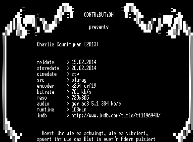 | FiLENAME: | Charlie.Countryman.2013.German.BDRip.x264-CONTRiBUTiON.mkv |