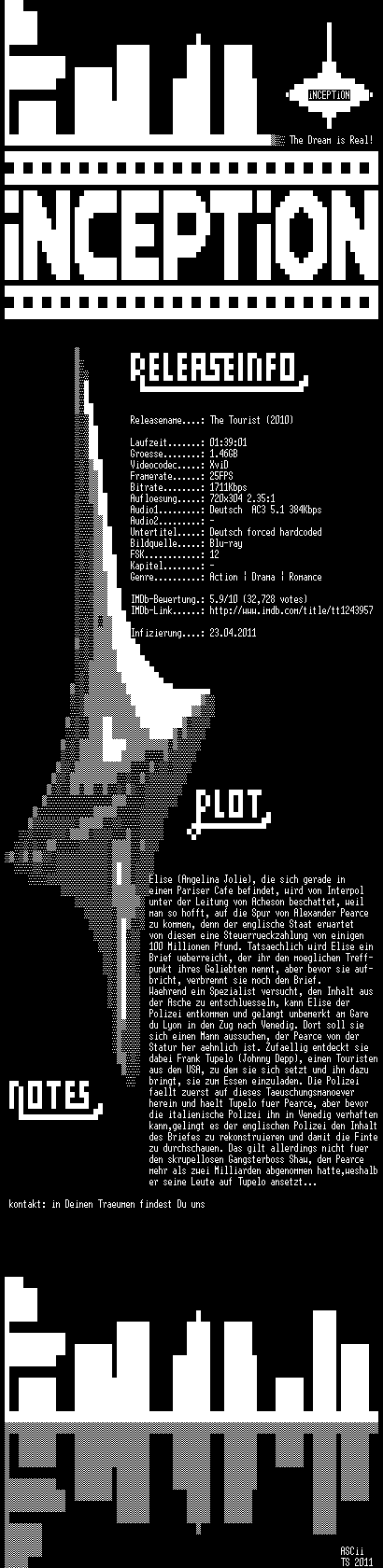 | FiLENAME: | The.Tourist.2010.German.AC3.BDRip.XviD-iNCEPTiON.avi |