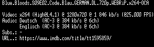 | FiLENAME: | Blue.Bloods.S09E02.Code.Blau.GERMAN.DL.720p.WEBRiP.x264-OCA.mkv |