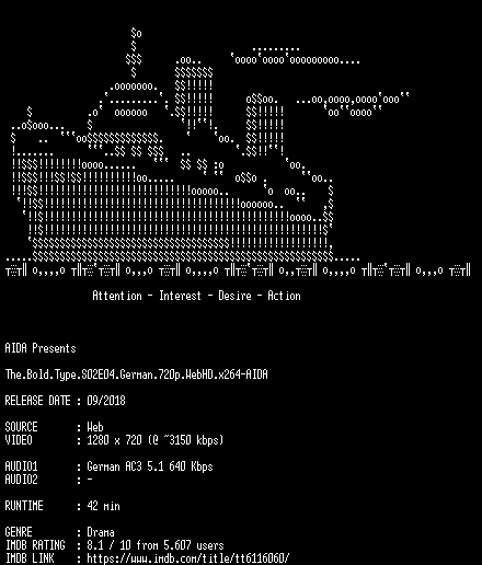 | FiLENAME: | The.Bold.Type.S02E04.German.720p.WebHD.x264-AIDA.mkv |
