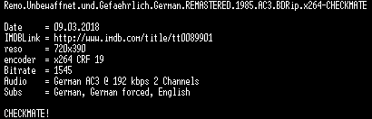 | FiLENAME: | Remo.Unbewaffnet.und.Gefaehrlich.German.REMASTERED.1985.AC3.BDRip.x264-CHECKMATE.mkv |