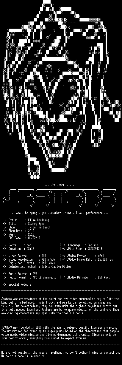 | FiLENAME: | Ellie_goulding-starry_eyed_(live_t4_on_the_beach_2010)-x264-2010-JESTERS.mkv |