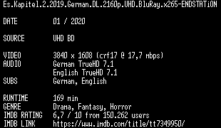 | FiLENAME: | Es.Kapitel.2.2019.German.DL.2160p.UHD.BluRay.x265-ENDSTATiON.mkv |