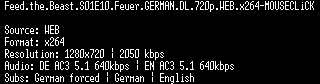 | FiLENAME: | Feed.the.Beast.S01E10.Feuer.GERMAN.DL.720p.WEB.x264-MOUSECLiCK.mkv |