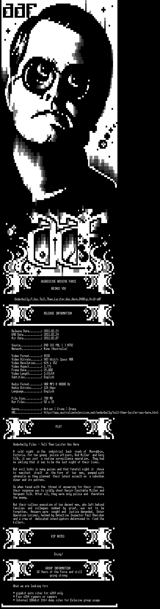 | FiLENAME: | Underbelly.Files.Tell.Them.Lucifer.Was.Here.DVDRip.XviD-aAF.avi |