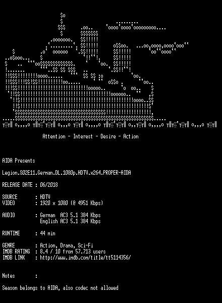 | FiLENAME: | Legion.S02E11.German.DL.1080p.HDTV.x264.PROPER-AIDA.mkv |