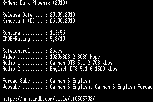 | FiLENAME: | X-Men.Dark.Phoenix.2019.German.DTS.DL.1080p.BluRay.x264-COiNCiDENCE.mkv |