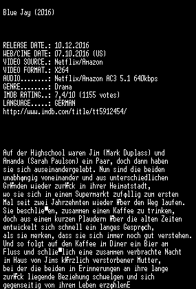 | FiLENAME: | Blue.Jay.2016.German.720p.WebHD.x264-SLG.mkv |