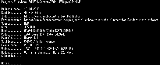 | FiLENAME: | Project.Blue.Book.S01E09.German.720p.WEBRip.x264-WvF.mkv |
