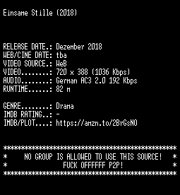 | FiLENAME: | Einsame.Stille.2018.German.WebRip.x264-SLG.mkv |
