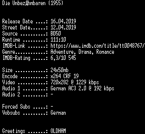 | FiLENAME: | Die.Unbezaehmbaren.German.1955.AC3.BDRiP.x264-SPiCY.mkv |