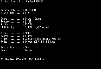 | FiLENAME: | Officer.Down.Dirty.Copland.German.2013.AC3.BDRip.XviD-1aQuali.avi |