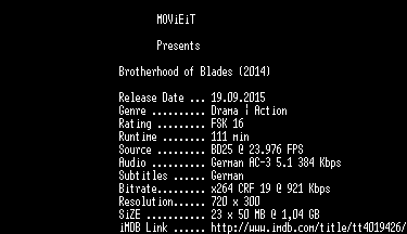 | FiLENAME: | Brotherhood.of.Blades.German.2014.AC3.BDRip.x264-MOViEiT.mkv |