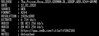 | FiLENAME: | The.Poison.Rose.2019.GERMAN.DL.1080P.WEB.X264-WAYNE.mkv |