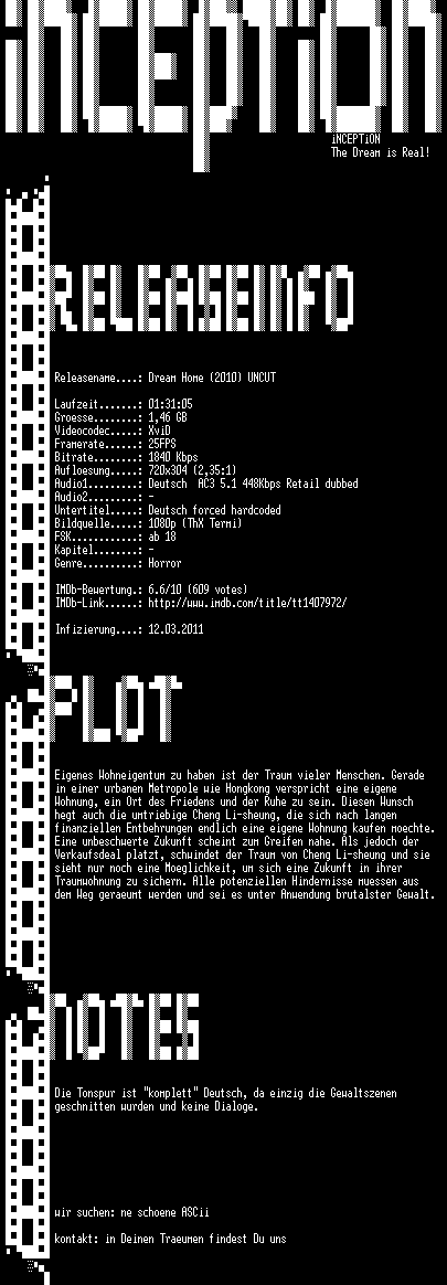 | FiLENAME: | Dream.Home.2010.UNCUT.German.AC3RD.HDRip.XviD-iNCEPTiON.avi |