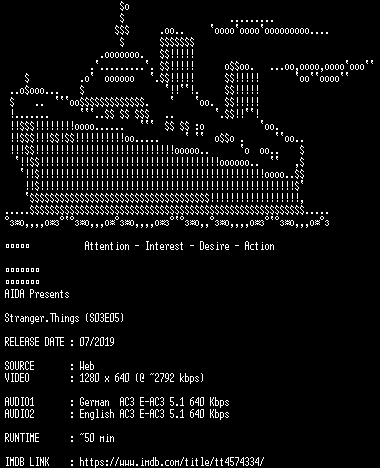 | FiLENAME: | Stranger.Things.S03E05.German.DL.720p.WebHD.x264-AIDA.mkv |